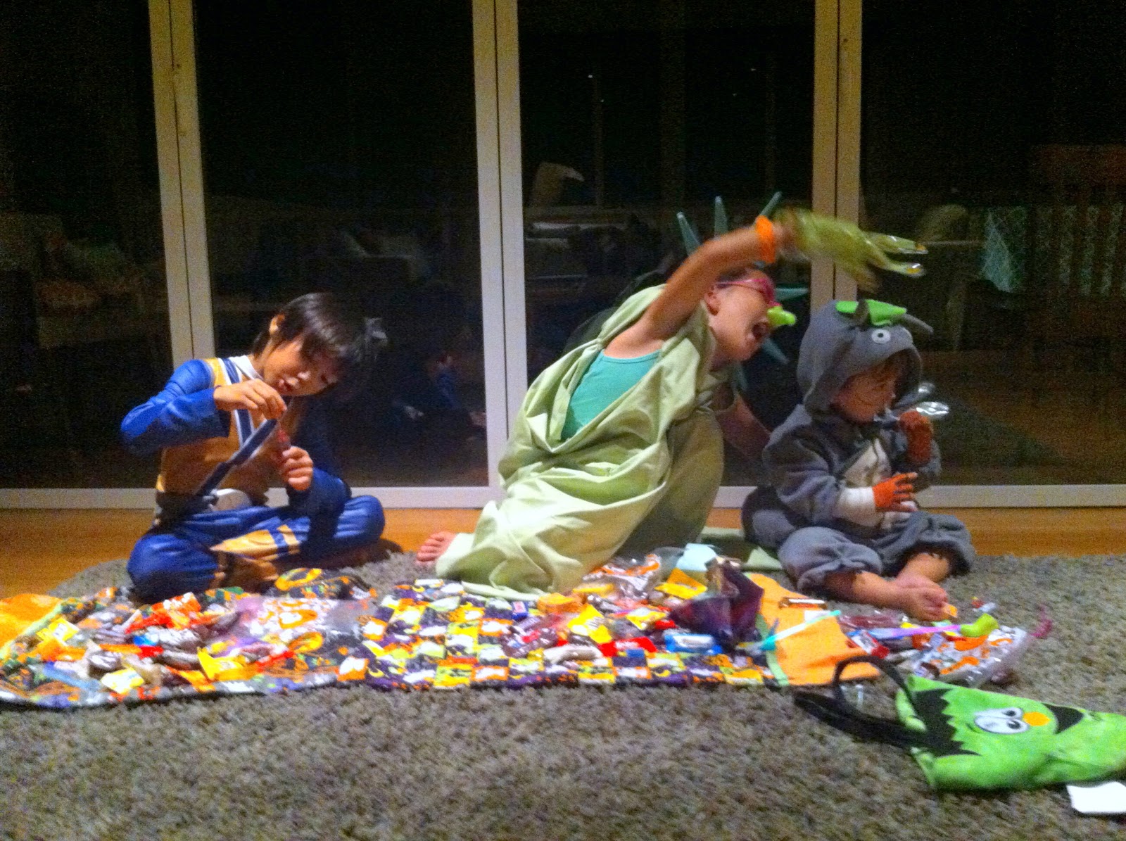I went home and passed out glow sticks (our tradition since I can remember), and Karl took our crew around. And since I did it when I was a kid, when they got home I made them dump out their stash for a photo. And then for the first time in a long time, we sat back and watched our kids and thought how cute they were... Samuel blowing bubbles, Eva putting on the scary gloves and glasses and trying to scare an oblivious Maximus, Maximus eating any candy he could unwrap... This is why we keep em' folks.
